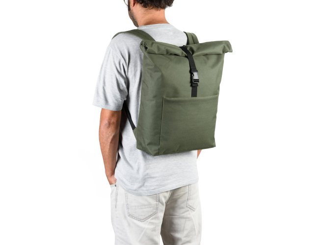 Mochila "Roll-top" para notebook em 600D e forro em 210D. Possui um compartimento principal espaçoso para notebook até 17.3", com fecho de enrolar no topo. Bolso frontal com zíper. Capacidade até 21 L.