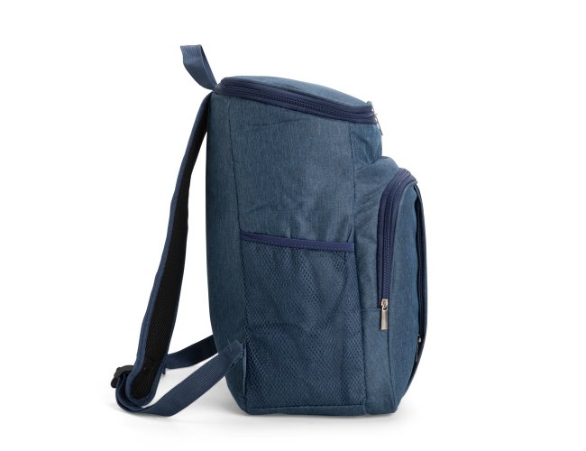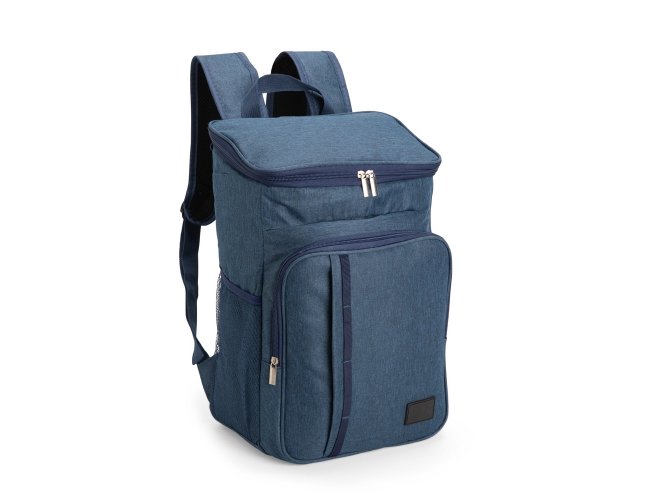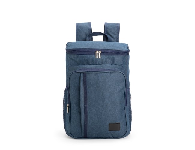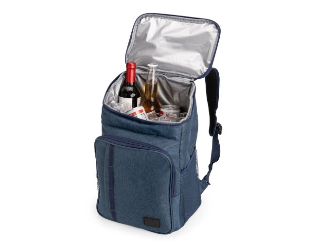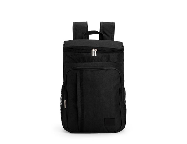 Mochila térmica em poliéster catiônico 300D impermeável com fechamento em zíper e capacidade máxima de 17 litros. Possui compartimento térmico em PEVA antivazamento, dois compartimentos frontais em tamanho diferentes, um par de bolsos em malha de elástico, além de alças de ombros com revestimento em espuma respirável, alça de mão em nylon e plaquinha fixa em PVC.