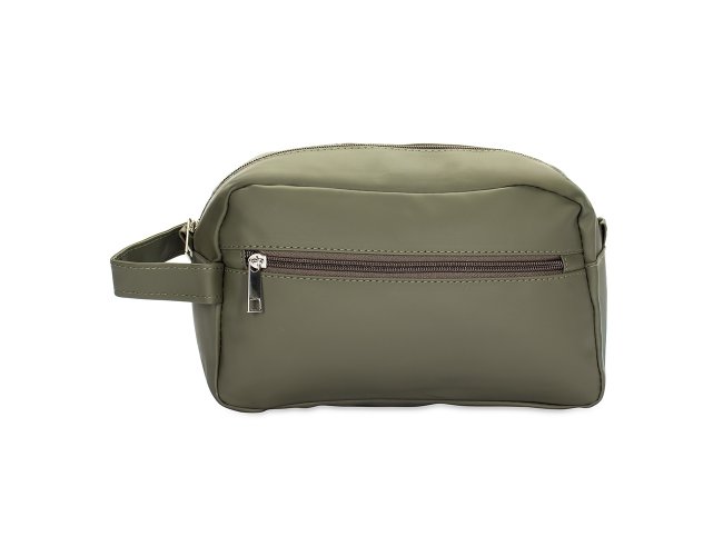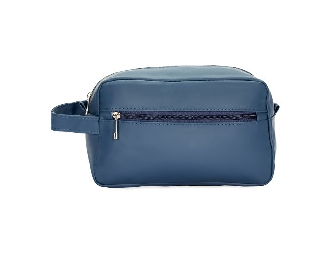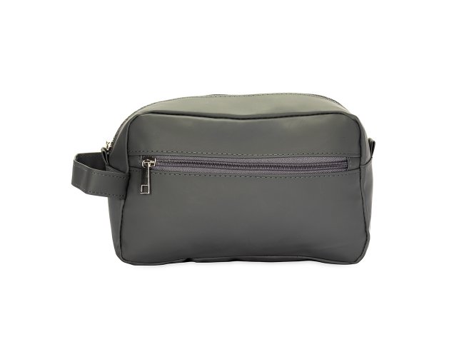 Nécessaire confeccionado em couro sintético impermeável. Possui compartimento principal com fechamento em zíper, além de um bolso frontal externo, alça de mão e duas alças menores para fixação de chaveiro ou gancho.