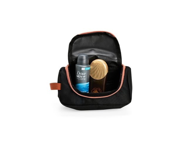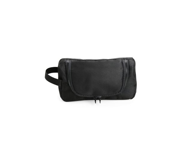 Nécessaire confeccionado em nylon resistente à água e fechamento em zíper. Possui divisória interna em tela de nylon e alça lateral para transporte.