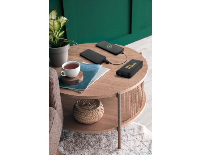 Bateria portátil com carregador por indução (wireless) em ABS 100% reciclado, com capacidade de 10.000 mAh e tela indicadora de nível de carga. A powerbank tem uma porta de entrada/saída USB-C e uma porta de saída USB, ambas de carregamento rápido PD 20W. O carregador wireless tem uma potência máxima de 15W. Incluso um cabo de carregamento com saída dupla USB-A/USB-C. Compatível com dispositivos móveis com tecnologia de carregamento sem fios. Fornecida em caixa presente de papel kraft reciclado.