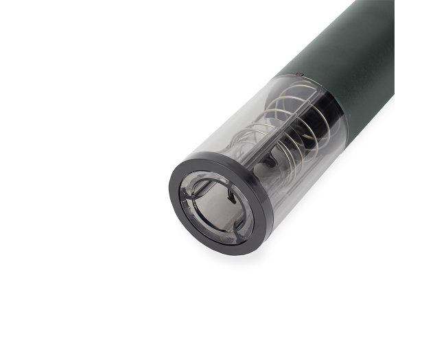 Saca-rolhas elétrico recarregável com estrutura em liga de alumínio, ABS, policarbonato e aço carbono, além de painel com iluminação em LED e botões de controle. Acompanha cabo USB-C para carregamento.