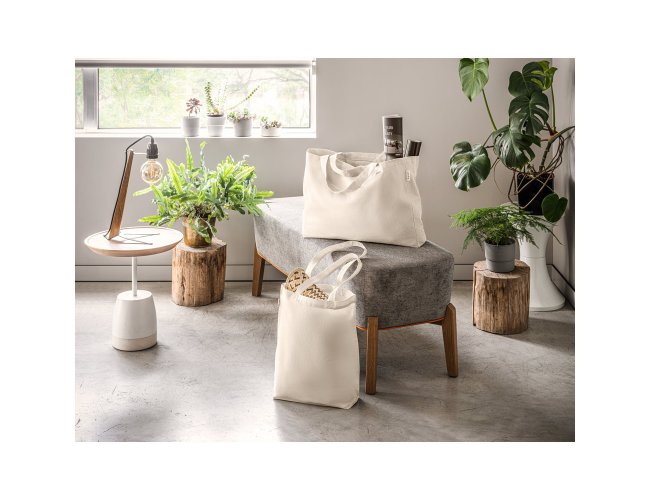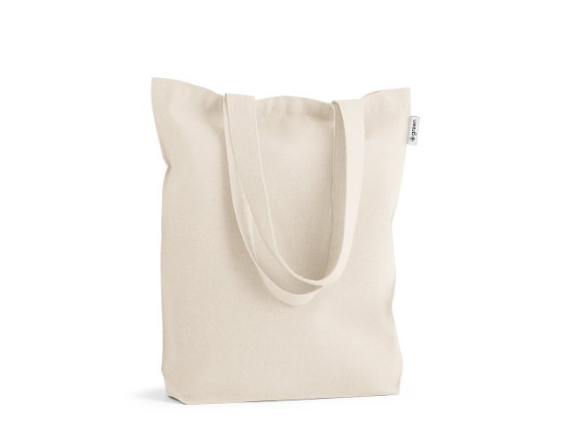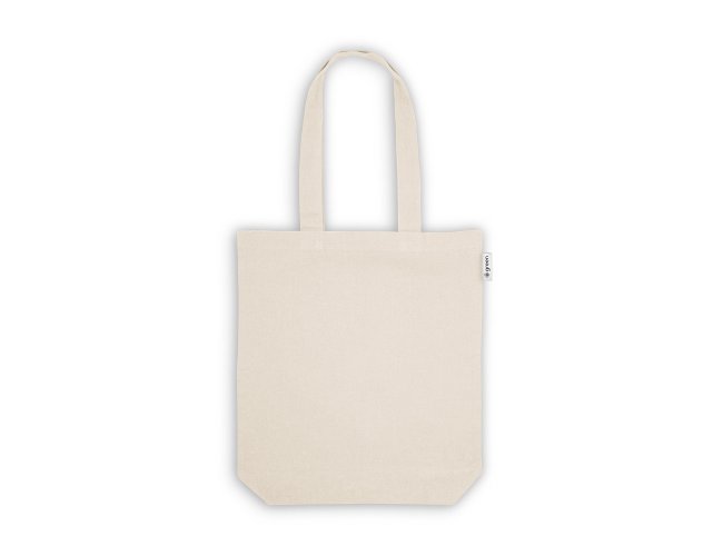 Sacola em 50% algodão, 30% algodão reciclado e 20% poliéster reciclado (220 g/m²), com alças de 62 cm.