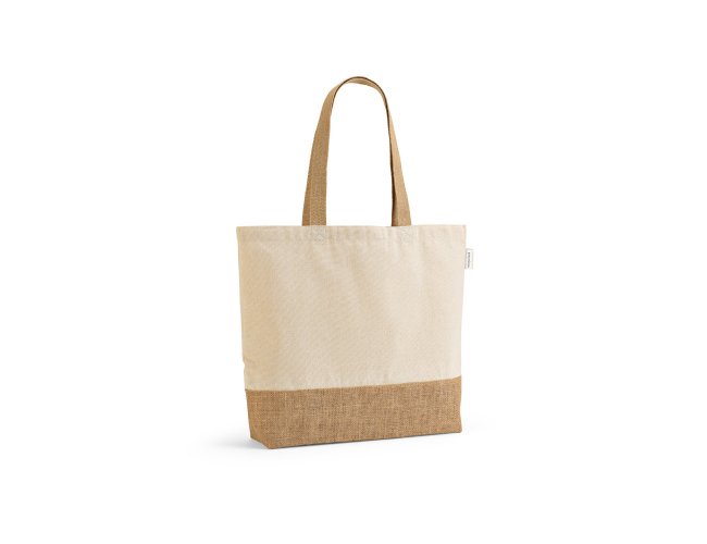 Sacola em 70% algodão reciclado e 30% poliéster reciclado (220 g/m²) com base em juta. Alças em webbing com 65 cm.