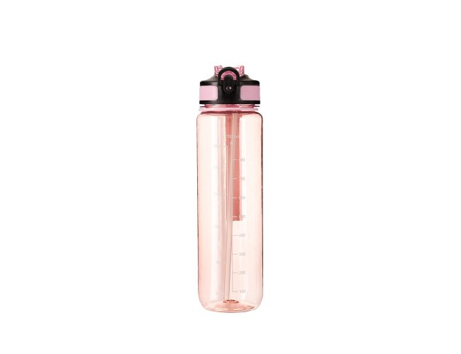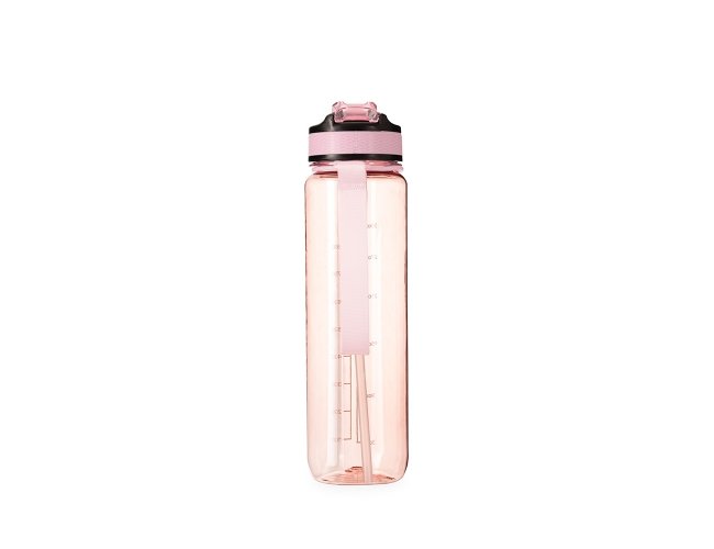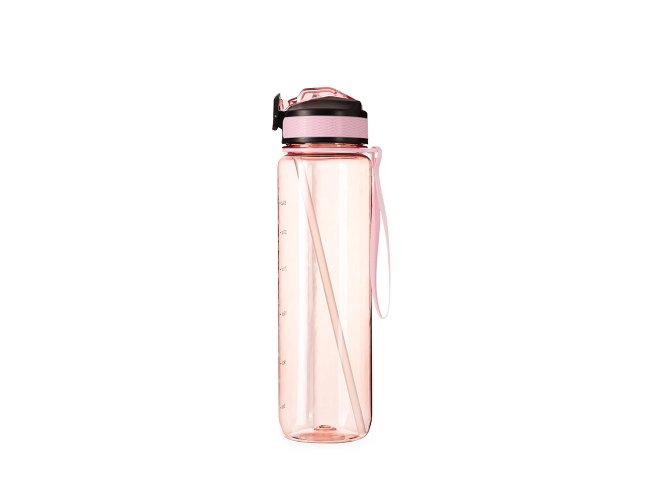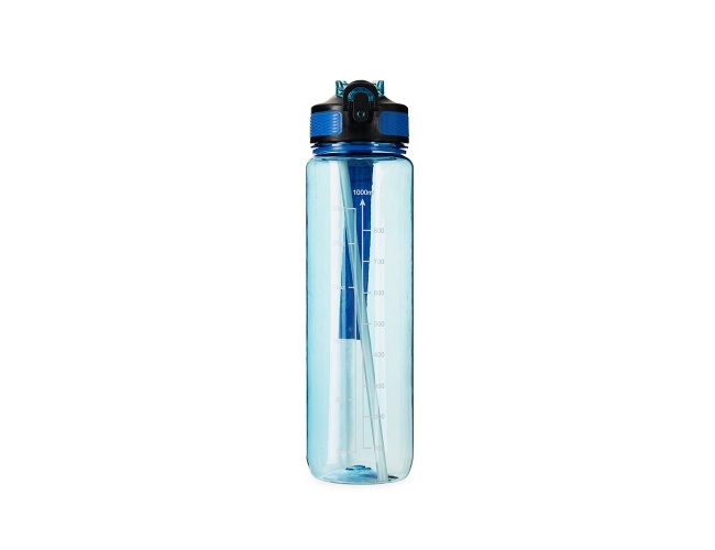 Squeeze plástico livre de BPA com capacidade máxima de 1,05L e marcação de volume de até 1L. Possui tampa rosqueável com bico flip, tampa protetora, botão de acionamento com trava de segurança. Acompanha canudo interno em plástico e alça para transporte em nylon.